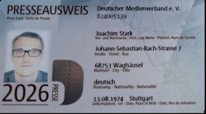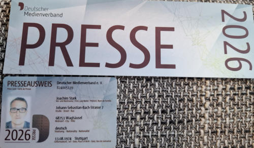 Aktueller Presseausweis und / oder aktuelles Presseschild (Vorderseite), ausgestellt von dem Presseverband
